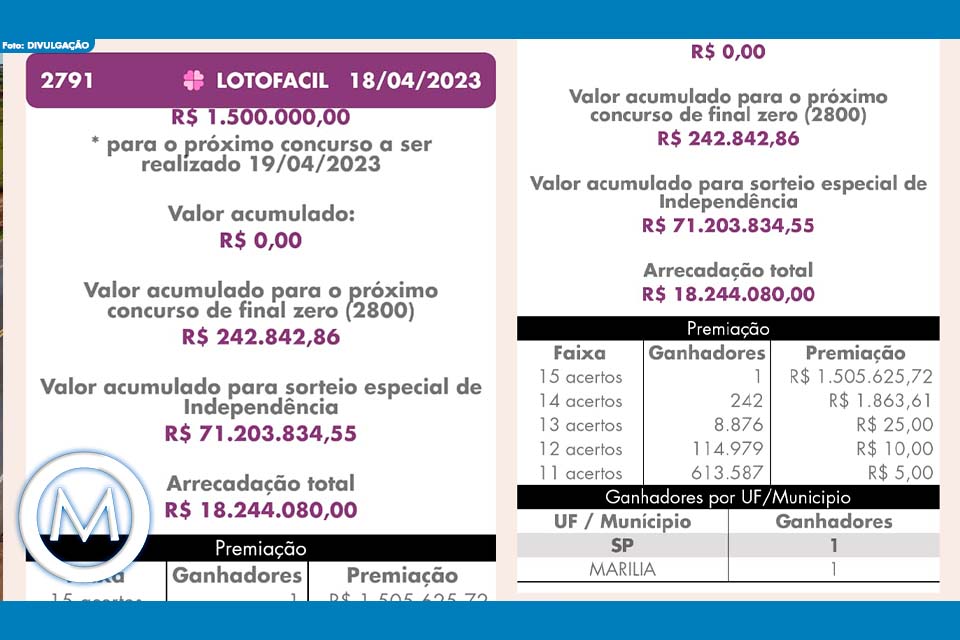 Que legal! No concurso 2.791 da Lotofácil, rolou um prêmio gigante de R$ 1.505.625,72, e adivinha só? Só teve um sortudo que levou tudo! Esse sortudo é da cidade de Marília e a aposta vencedora foi realizada na Lotérica Maria Izabel, que fica na avenida Vicente Ferreira, no bairro Cascata, na zona Leste da cidade.